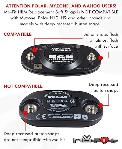 ✔️ NOT COMPATIBLE WITH: MyZone, Polar H9, Polar H10, Garmin HRM-Tri/ Swim, Garmin HRM Classic, Peloton, Wahoo Tickr (2020 3rd Gen), and brands and models with deep recessed button snaps (See our diagram).