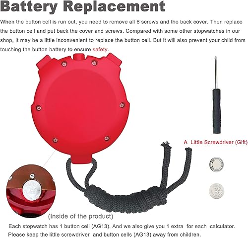 1 Small Screwdriver - For most stopwatches on the market, when the battery is almost exhausted, you need to lift the back cover to replace the battery. Sometimes it is not easy to find a suitable screwdriver when you need it. Good news. You will get 1 pcs when you choose to make a order from us. Only powered by 1 AG13 button cell. Note: please keep the small screwdriver and spare button cells from your kids for safety